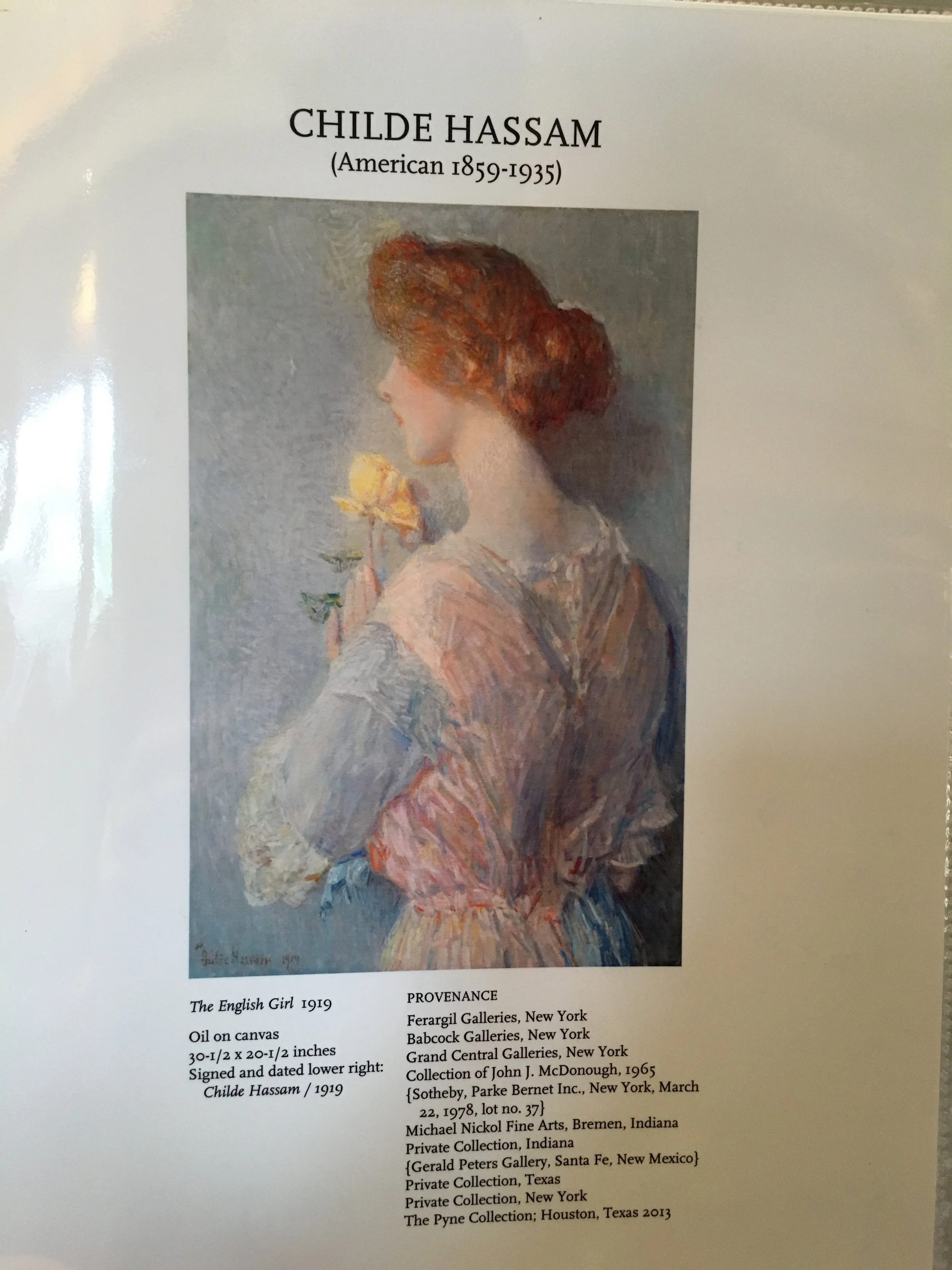 The English Girl has been reviewed and catalogued by the Childe Hassam Catalogue Raisonné currently in preparation. It has been assigned a number of 1915.004 in the catalog database.